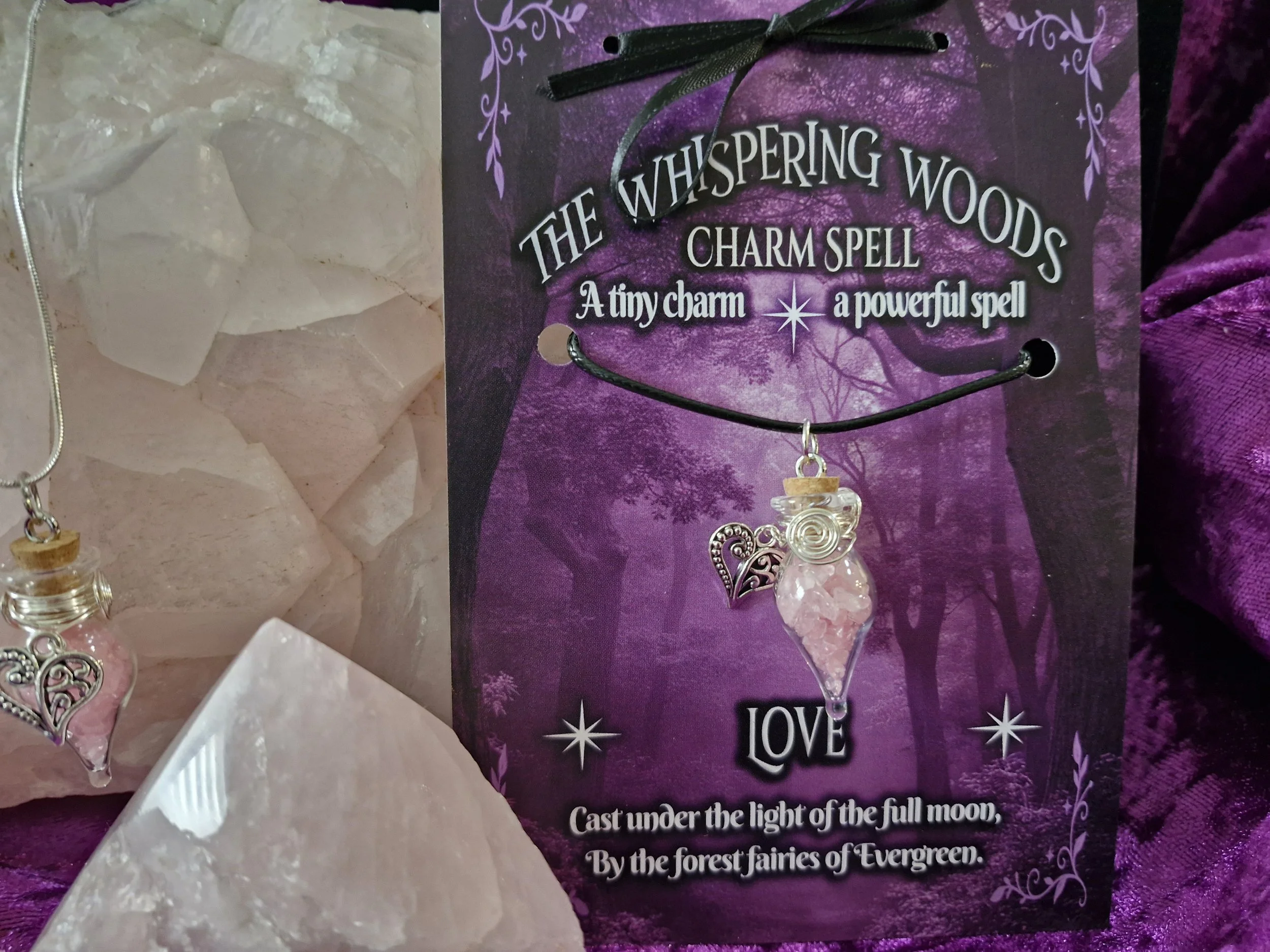Symbolic charm necklaces inspired by the quiet magic of the forest. Each piece holds a tiny crystal vial and a Whispering Woods spell to focus intention and invite a whisper of everyday magic.